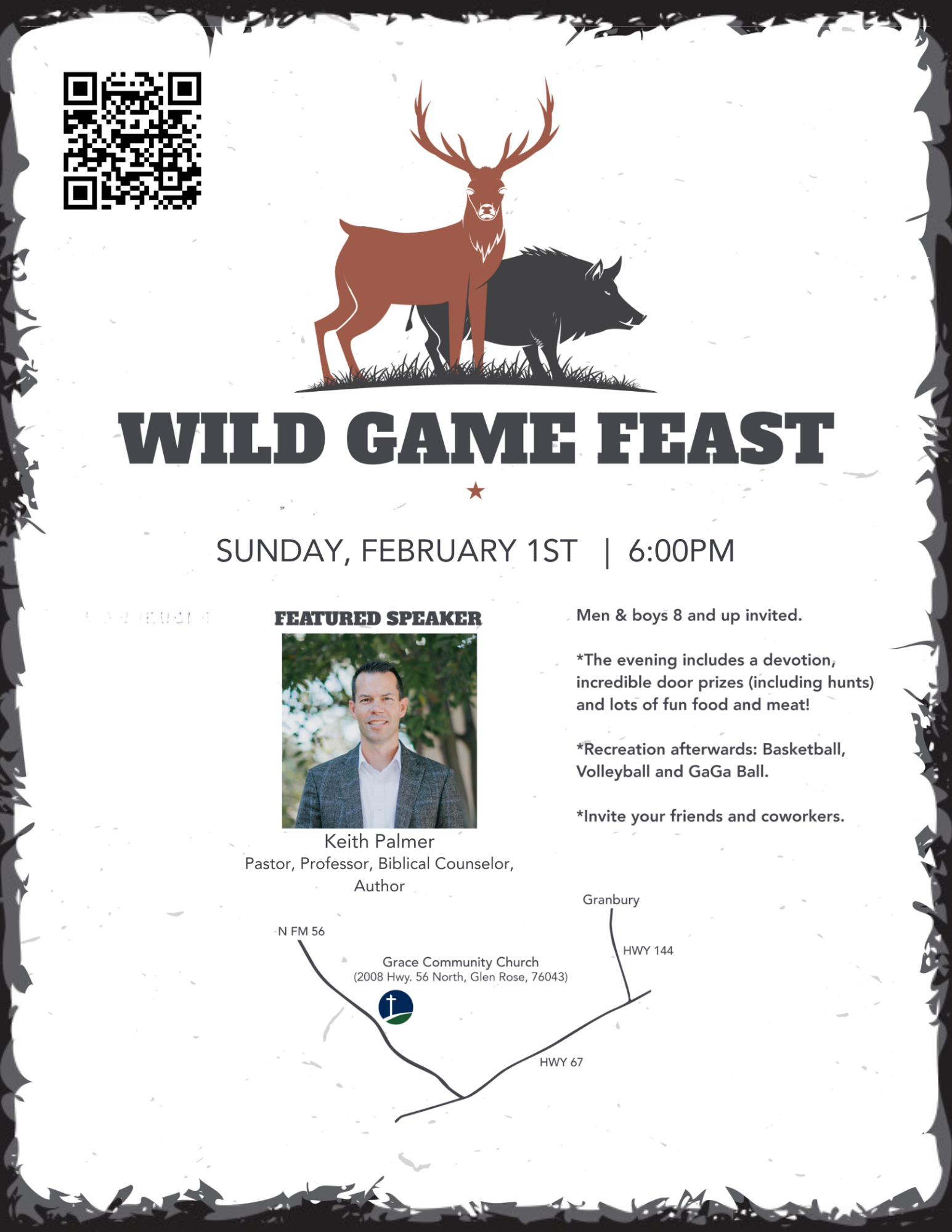 Men (and boys 8 and up) join us on Sunday, February 1 for this free evening of good food (meat!), incredible door prizes, and great teaching from pastor, professor, biblical counselor, and author Keith Palmer.